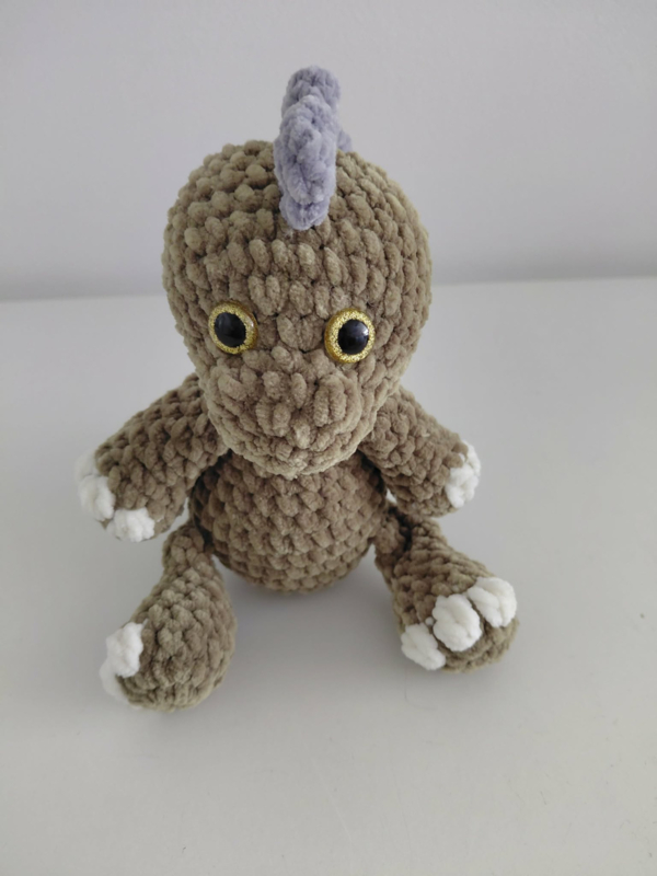 Velvet Dino LarsLeuke dino gehaakt met velvet garen van Durable. De kleur is 2168 Khaki met de stekels in 2227 Mouse Grey. Met mooie goud kleurige glitter ogen.