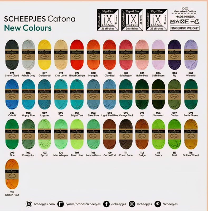 Scheepjes Catona 25 - Golden Hour 119SCHEEPJES CATONA 25 GRAMScheepjes Catona 25 gram is klein, maar zéér fijn! Scheepjes Catona is een prachtig en glanzend haakkatoen. De draad bestaat uit 100% gemerceriseerd katoen en is geschikt voor naalddikte 2,5-3,5 mm.…