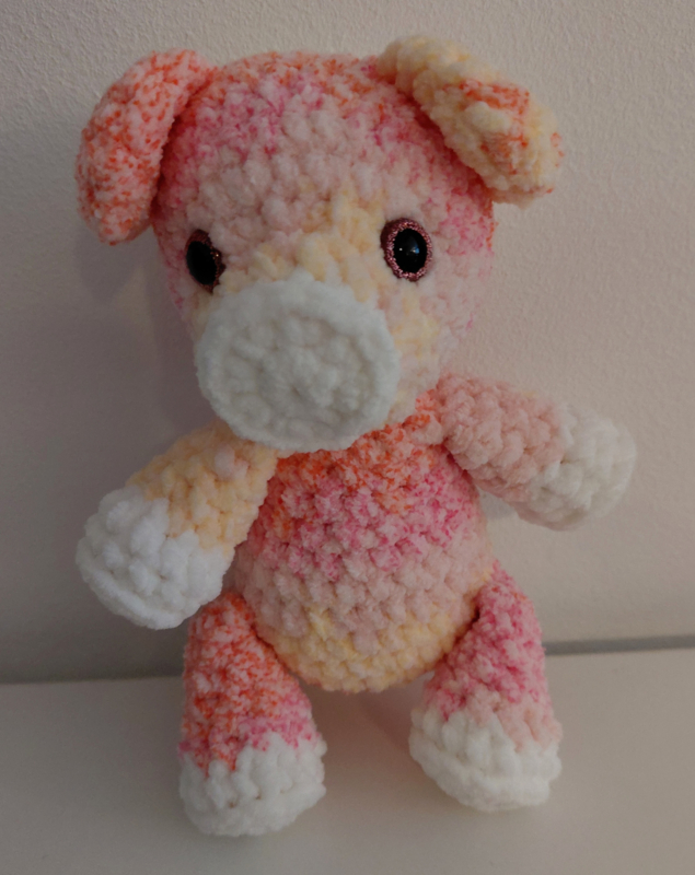 Velvet gemeleerd Biggetje BellaLeuk biggetje gehaakt met velvet garen van Scheepjes. De kleur is Little darling Sprinkled 05 Strawberry. Met mooie roze glitter ogen.