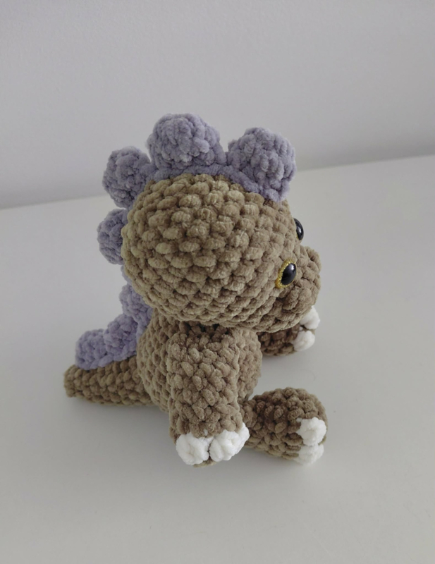 Leuke dino gehaakt met velvet garen van Durable. De kleur is 2168 Khaki met de stekels in 2227 Mouse Grey. Met mooie goud kleurige glitter ogen.